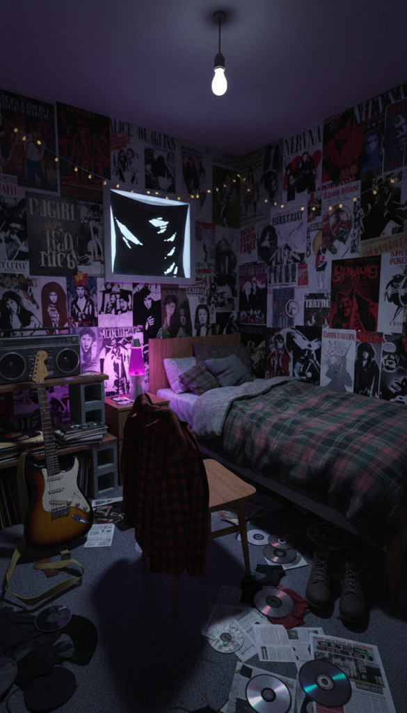 Messy can be aesthetic too. This layout embraces chaos with posters covering the walls, clothes on the floor, and a darker, moodier color palette mixed with plaid.