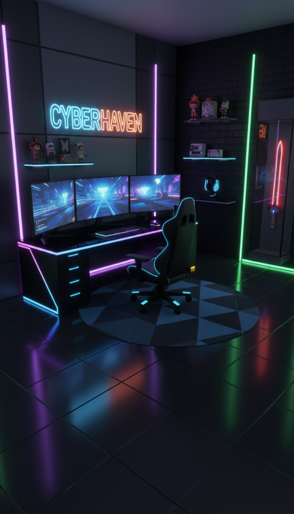 This is for the tech-savvy Robloxian. The focus here is on the desk setup and lighting. Darker wall colors work best here to allow the neon accents (RGB) to pop, creating an immersive gaming cave.