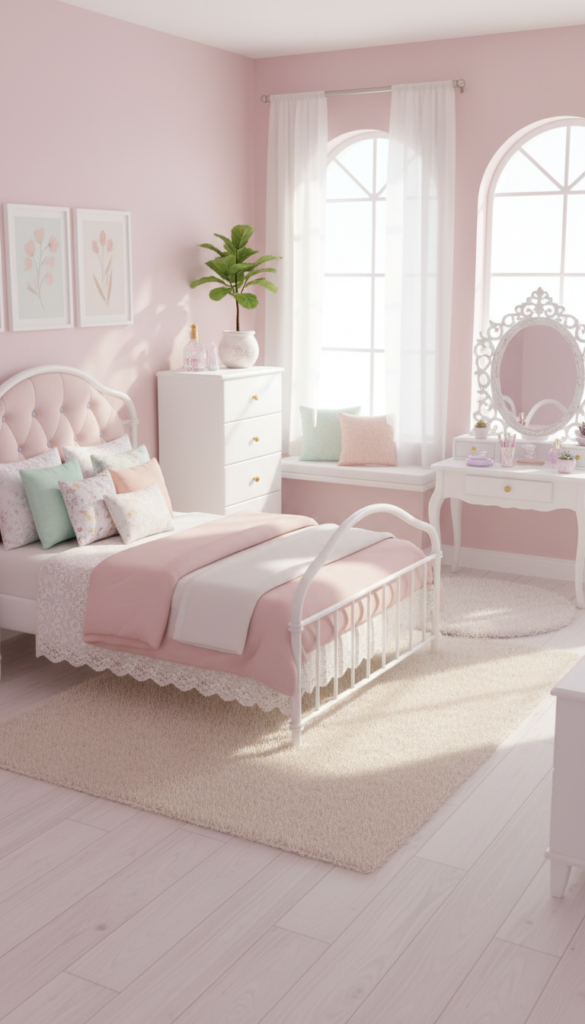- Choose a pale pink texture for the walls and match it with white baseboards.