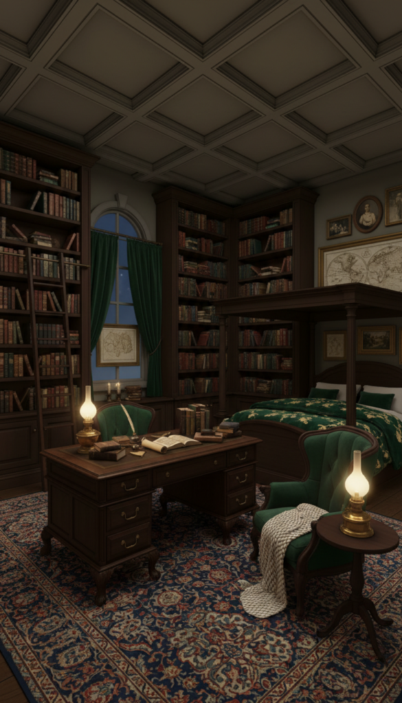 Moody, intellectual, and sophisticated. This layout feels like an old library. It requires a higher budget due to the detailed expensive furniture, but the result is timeless and elegant.