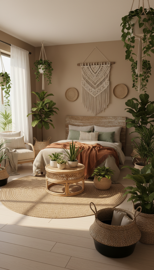 This style brings the outdoors in. It is relaxed, eclectic, and filled with greenery. The key here is mixing textures like rattan, wood, and macramé to create a laid-back vibe.