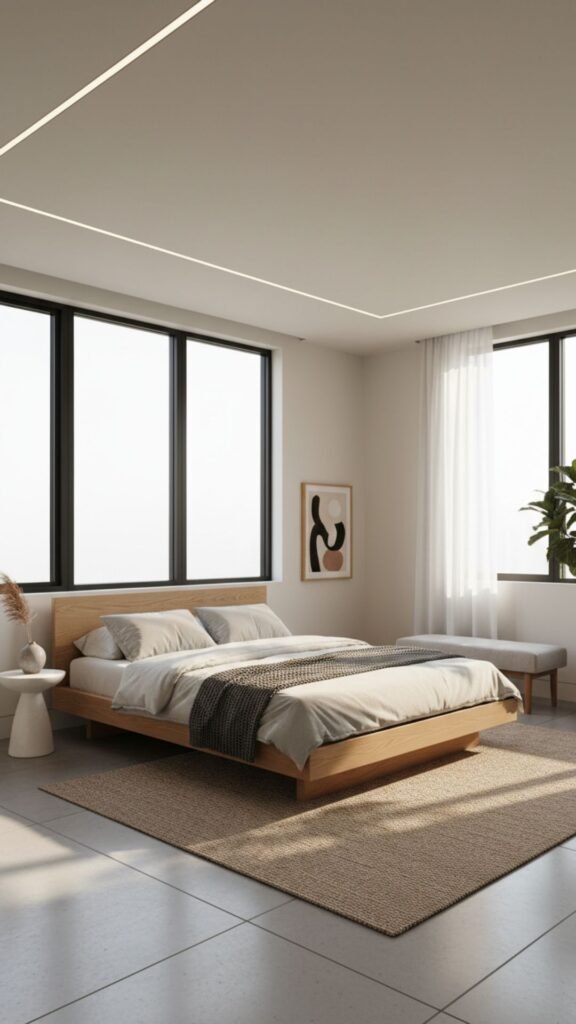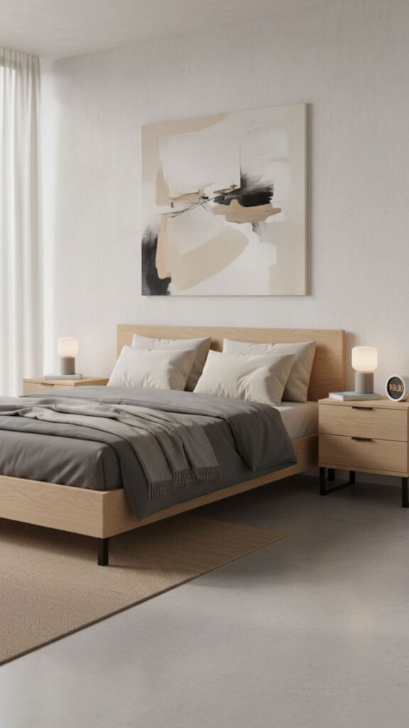 A minimalist bed frame anchors the room without overpowering it. Low-profile designs create a sense of vertical space, making the room feel airier and less cluttered.