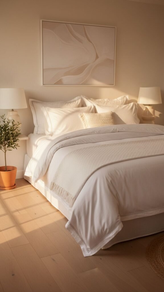 Nothing says “clean and calm” quite like hotel-quality white linens. They provide a blank canvas that brightens the room and feels instantly refreshing.
