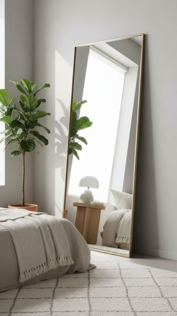 A floor mirror reflects light, making the room feel larger and brighter, while serving a key functional purpose.