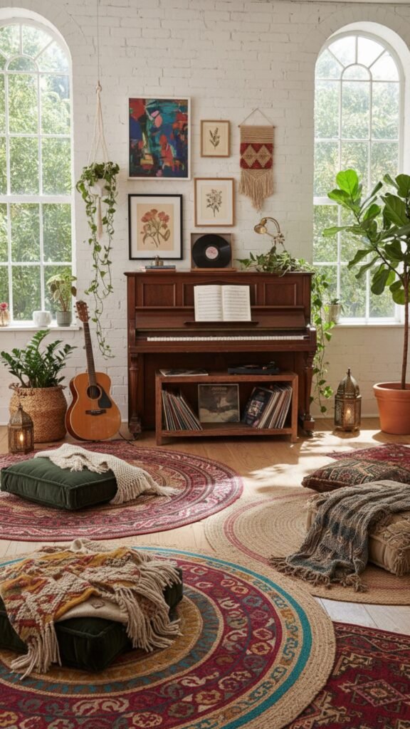 Center your room around a piano, a collection of acoustic guitars, or a vintage record player. This setup invites impromptu jam sessions and active listening rather than passive viewing.