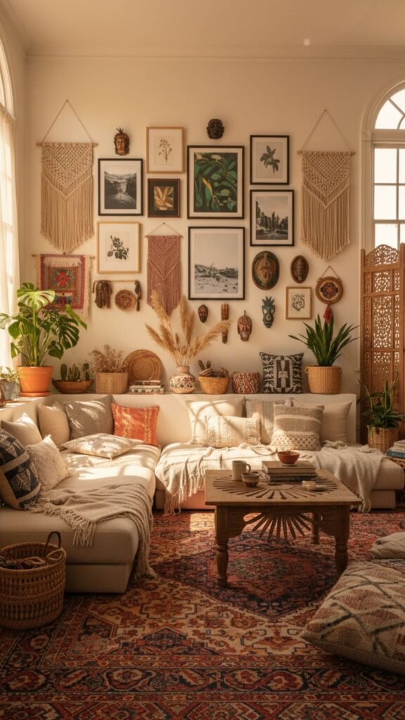Showcase your travels and eclectic taste by displaying unique art pieces, masks, and tapestries. A gallery wall serves as a stunning, conversation-starting focal point.