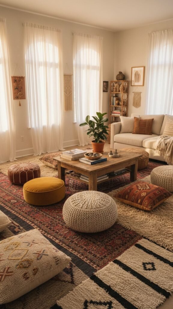 Embrace the relaxed, grounded nature of true bohemian style with low-profile seating. This creates a casual, intimate environment perfect for hosting friends.