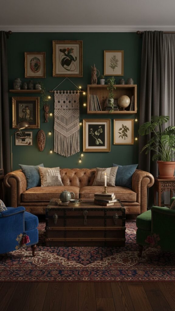 Create a moody, academic-inspired boho space. This design relies on dark, rich colors and antique furniture pieces that tell a story.