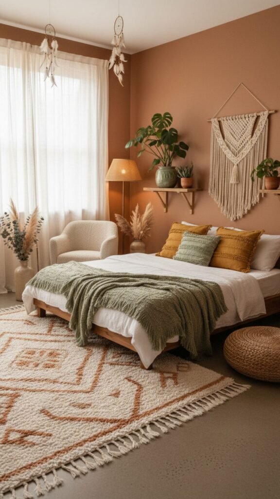 A true boho room starts with a grounded, nature-inspired foundation. Warm terracotta, sage green, and soft mustard yellow bring an inviting warmth to your walls and fabrics. This color scheme instantly sets a calming mood for the entire space.