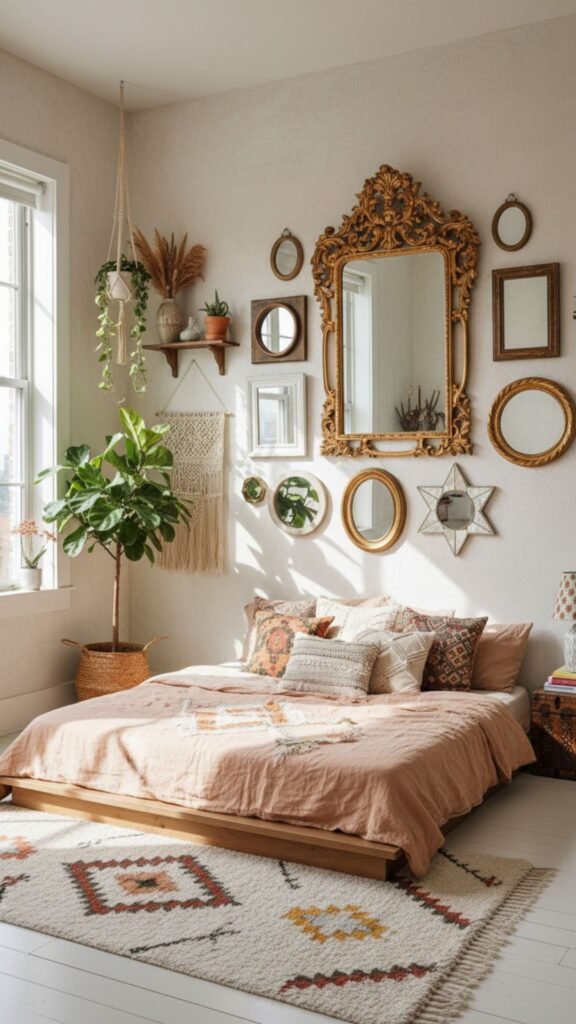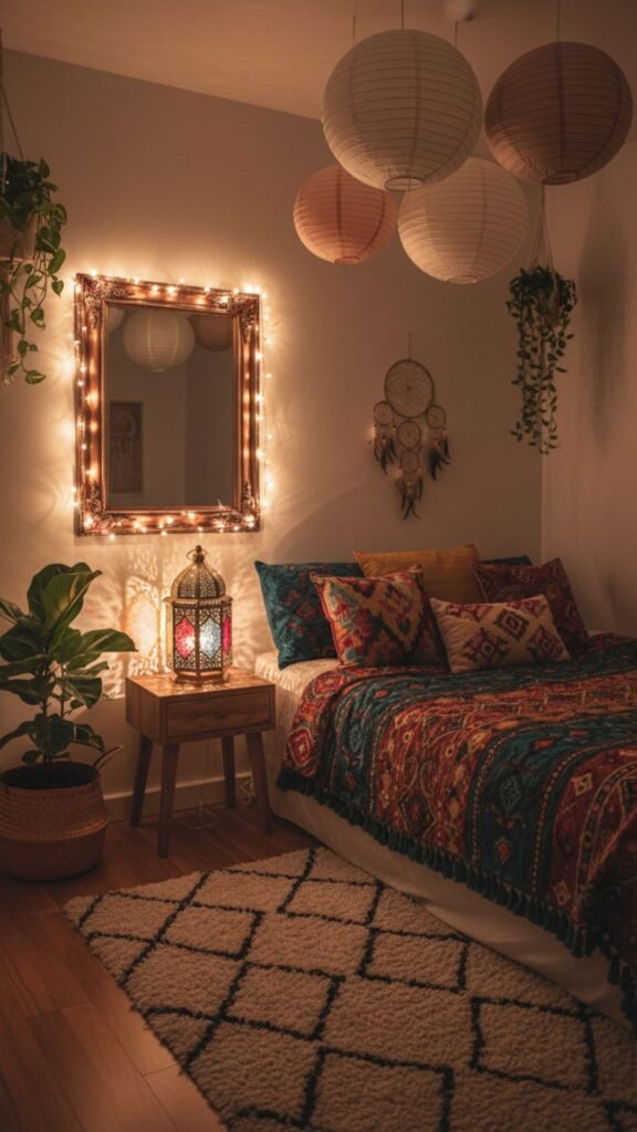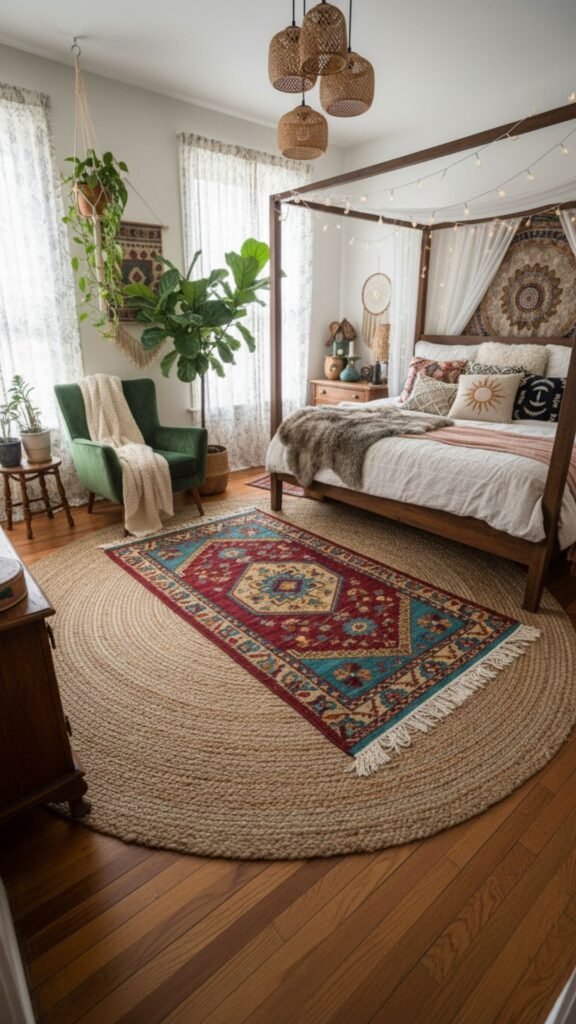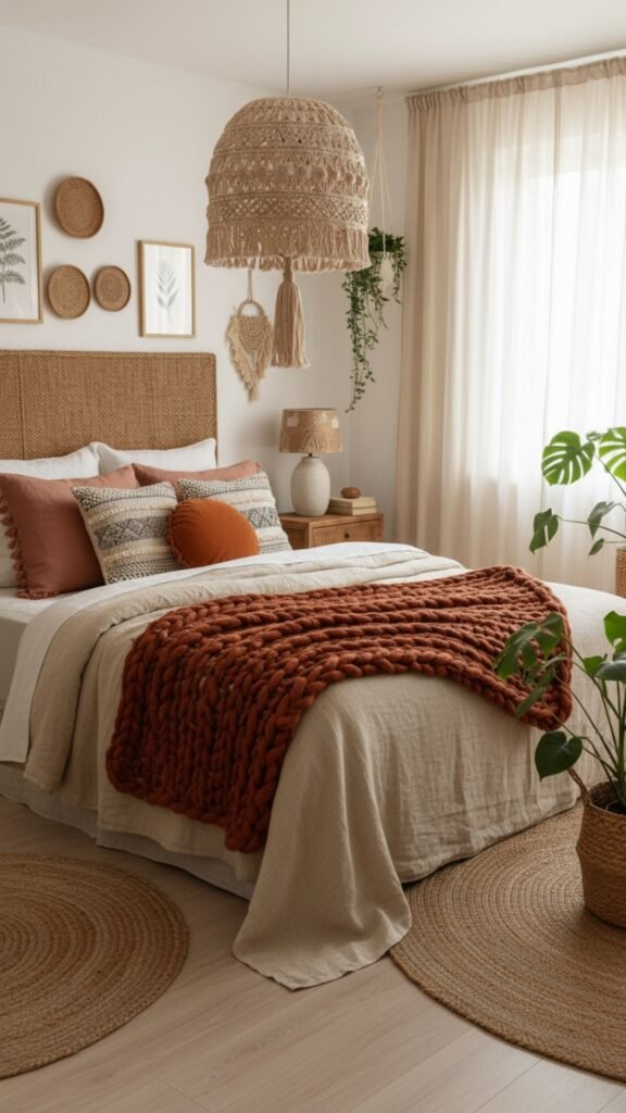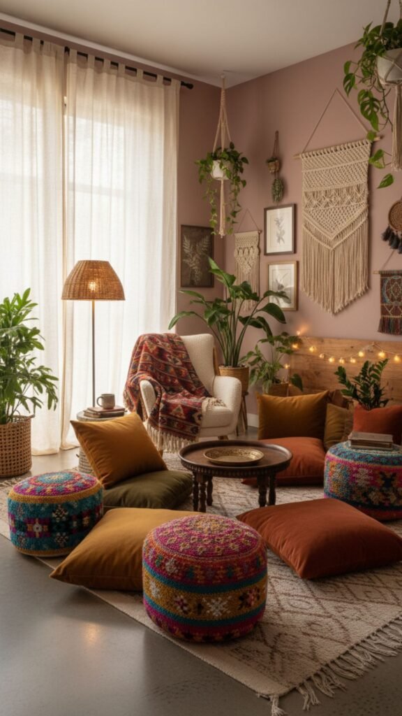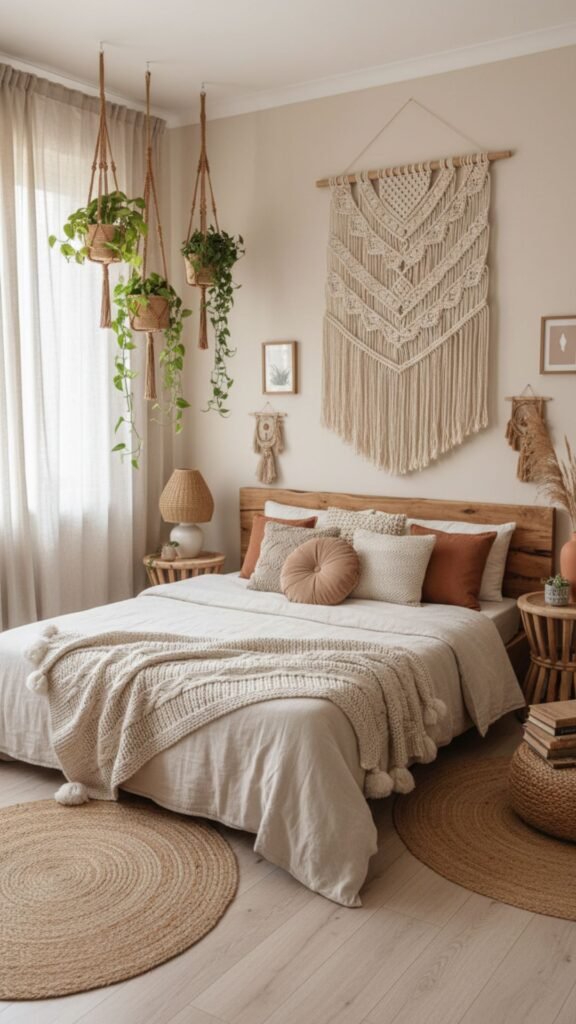 Boho design encourages relaxed lounging and low-level seating. Oversized floor cushions and textured poufs make your bedroom feel like a comfortable gathering space. They are perfect for reading, meditating, or chatting with friends.