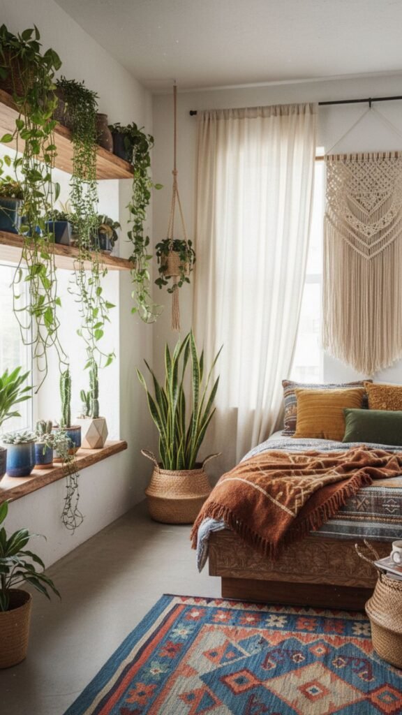 Houseplants breathe life into any room while purifying the air. A mix of trailing vines, large leafy floor plants, and small succulents brings the outdoors inside. Plants are essential for achieving that lush, vibrant boho aesthetic.