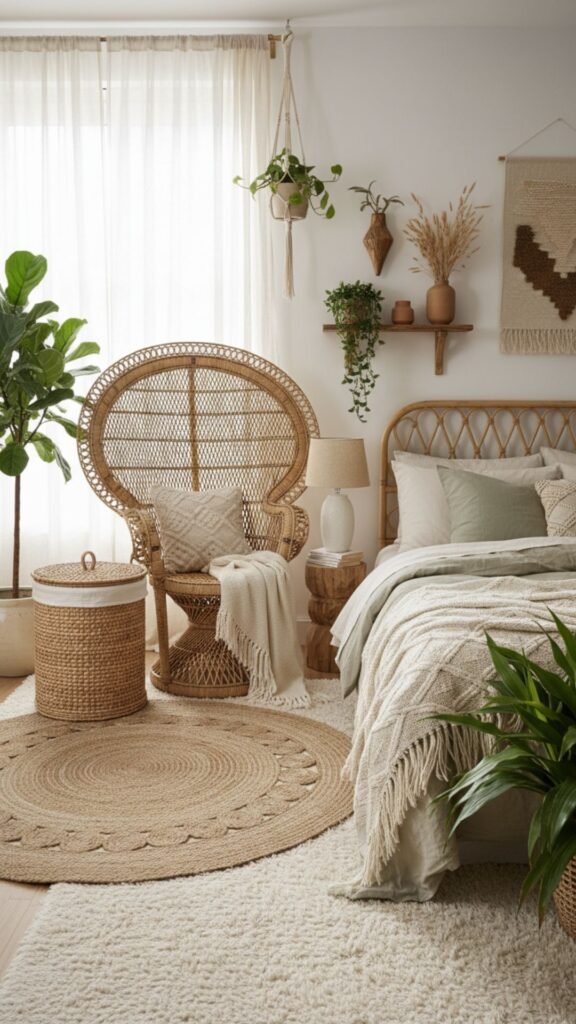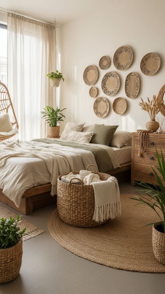 Storage does not have to be boring or purely functional. Woven seagrass or belly baskets offer an attractive way to hide clutter while adding organic texture. They keep your space organized while perfectly matching the bohemian theme.