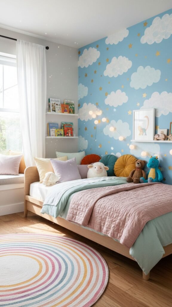 A bold feature wall can instantly transform a bedroom, and peel-and-stick wallpaper makes it easier than ever. Choose playful patterns like clouds, stars, or jungle animals to add personality without the commitment or mess of traditional wallpaper.