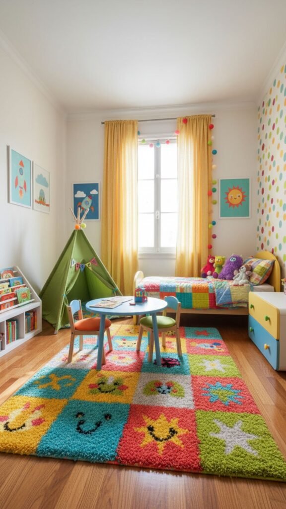 A soft area rug defines the space and adds comfort underfoot. Look for machine-washable options in fun patterns or bright colors that can handle spills and heavy use.