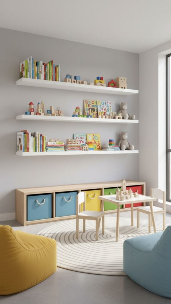 Open bins and baskets make it easy for kids to clean up independently. Label each container with pictures or words so children know where items belong. Under-bed storage and wall-mounted shelves maximize space while keeping toys accessible.