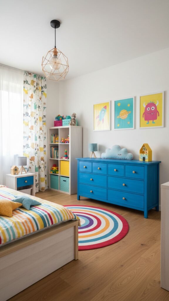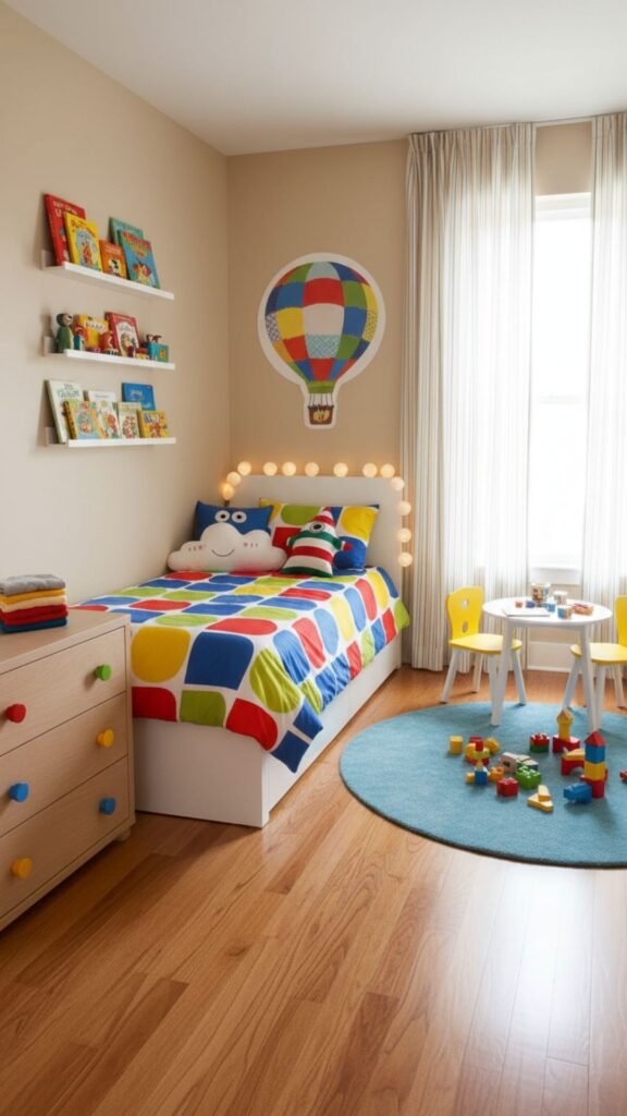 String lights create a warm, magical atmosphere that kids adore. Drape them above the bed, around windows, or along shelves to add soft lighting that doubles as decor.