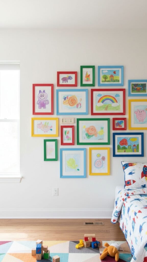 Display your child’s artwork and favorite prints on a gallery wall. Use inexpensive frames in coordinating colors or create a collage with washi tape for a no-damage solution.