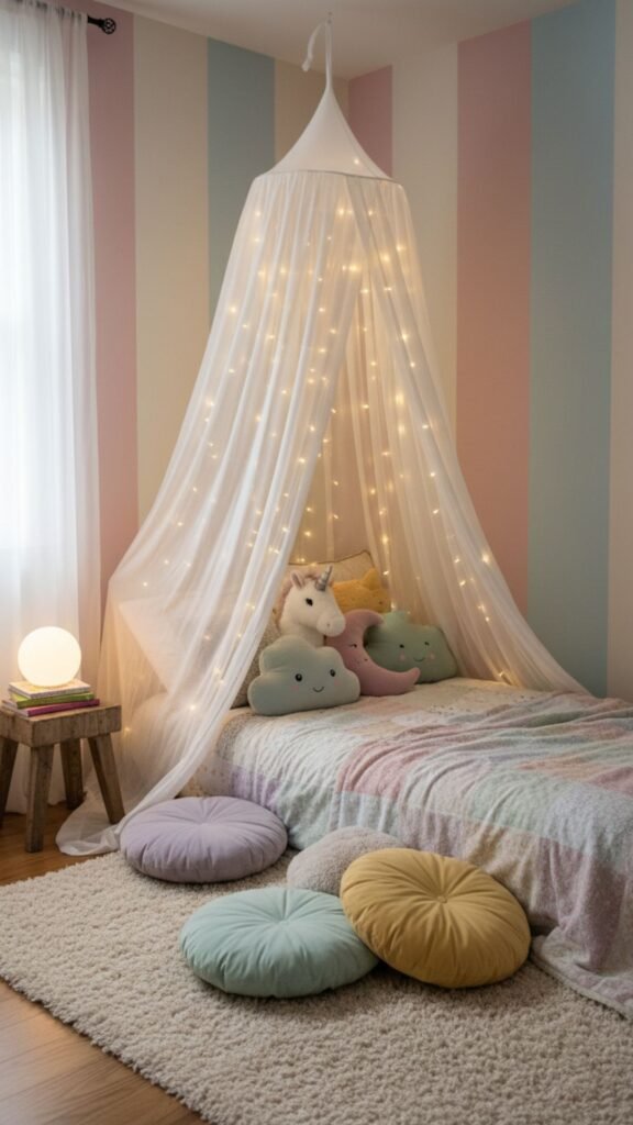 A bed canopy or play tent creates a sense of privacy and adventure. Drape sheer fabric from the ceiling or set up a pop-up tent in a corner for an instant hideaway.