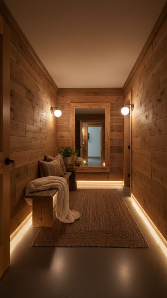 Give your hallway instant rustic character with reclaimed wood paneling. The weathered texture and natural variations in the wood create an authentic cabin feel that’s both timeless and inviting.