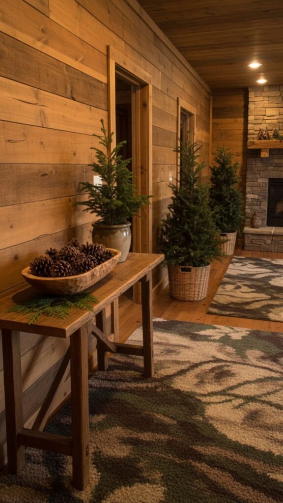 Ground your hallway with a natural fiber runner that adds texture and warmth underfoot. Jute, sisal, or wool rugs bring organic elements that complement the cabin aesthetic perfectly.