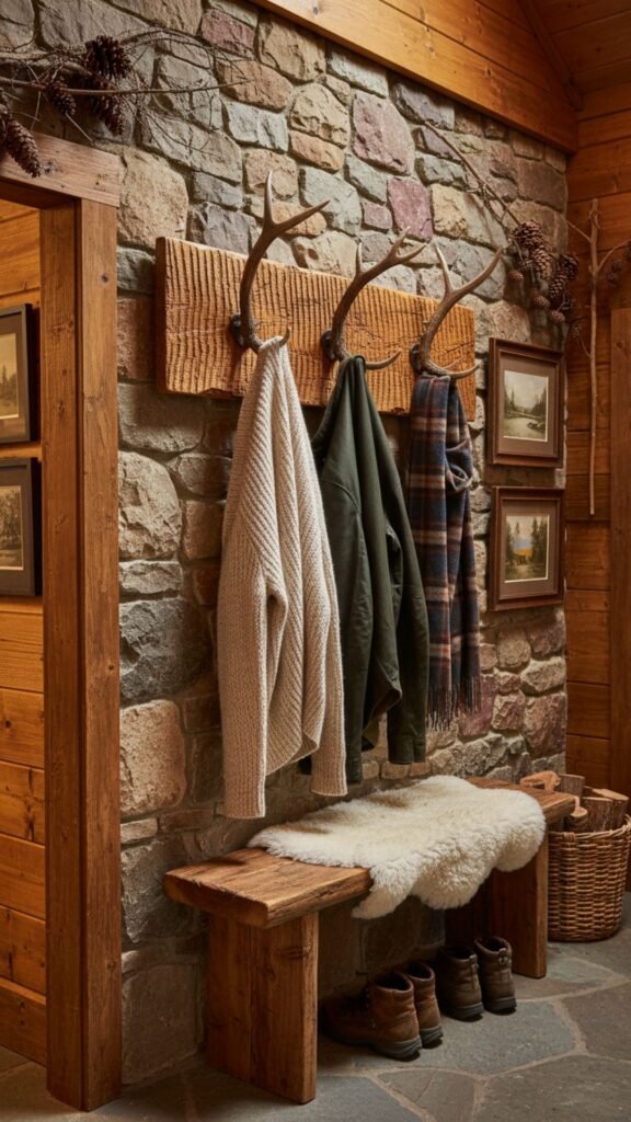 Replace conventional hooks with antler mounts or natural branch hooks for functional decor that captures the essence of a woodland cabin.