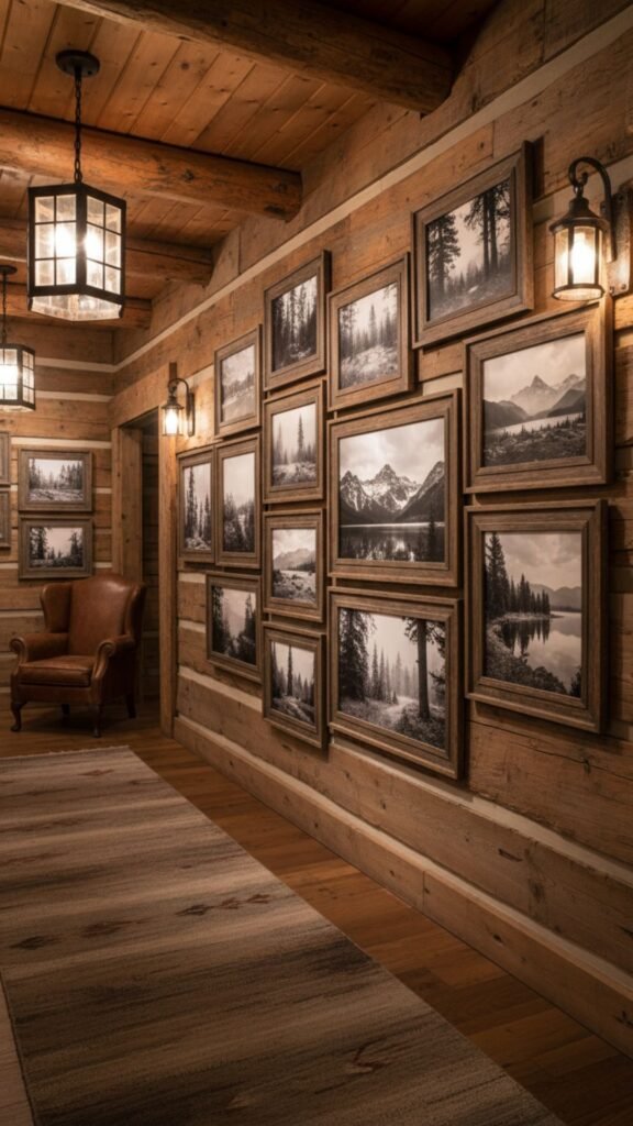 Create a curated gallery wall featuring black-and-white nature photography or vintage cabin scenes. This adds personality while reinforcing the connection to the outdoors.
