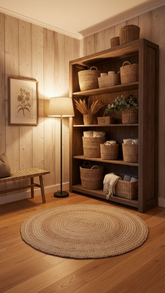 - Place large floor baskets in corners for storing extra blankets or pillows