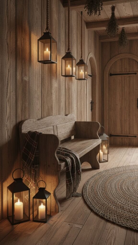 Replace standard hallway fixtures with vintage-style lanterns to add ambiance and rustic charm. These statement pieces provide soft, diffused lighting that mimics the glow of a mountain cabin at dusk.