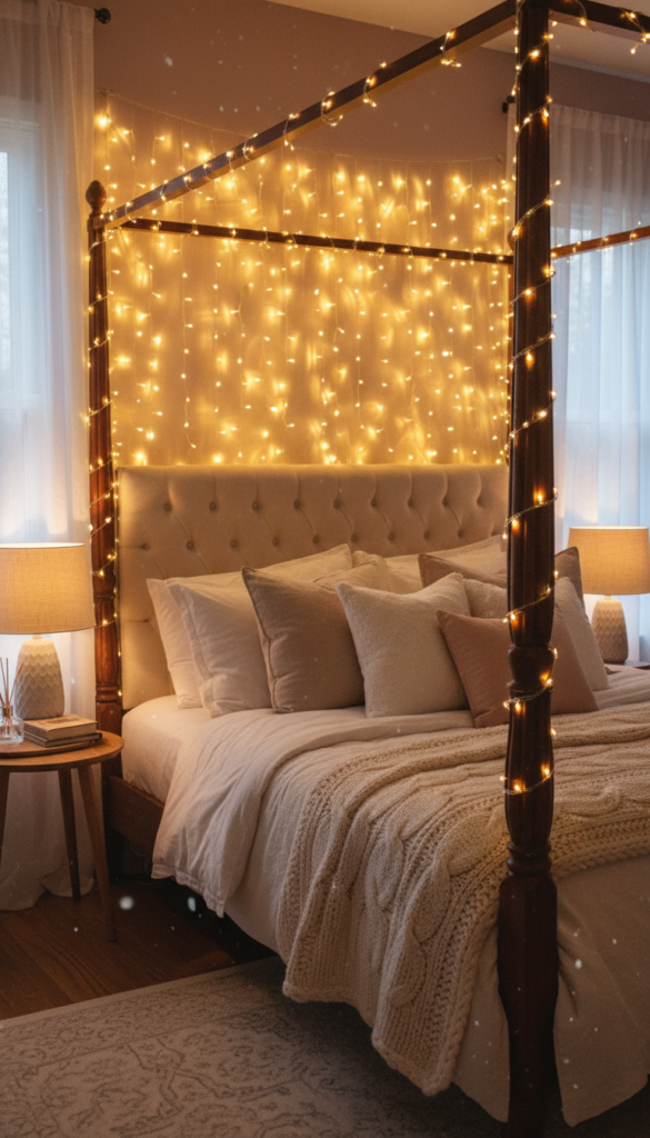 Nothing screams “cozy” quite like soft, warm lighting. Creating a canopy of lights transforms your bed into a magical fort perfect for winter nights.