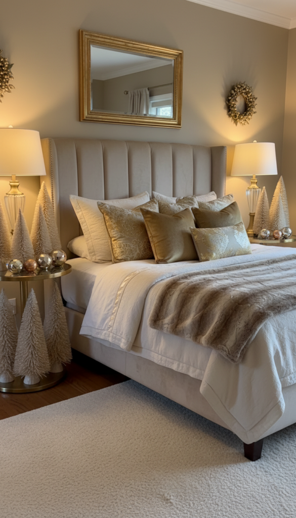 If you want your bedroom to feel luxurious and sophisticated, swap the red and green for shimmering metallics.