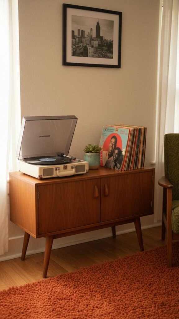 Display your musical taste while adding a nostalgic touch to your living room. A dedicated spot for a record player brings both auditory and visual warmth to the space.