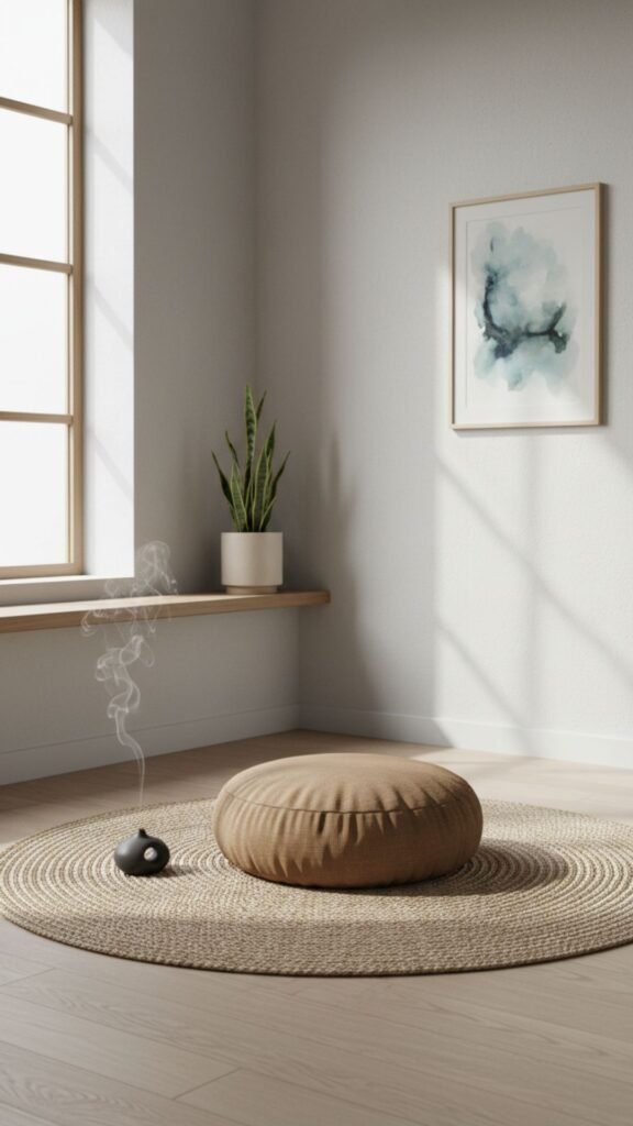 Designate a quiet zone for mindfulness and relaxation. Minimalist decor and soft textures help clear the mind and promote a sense of calm.