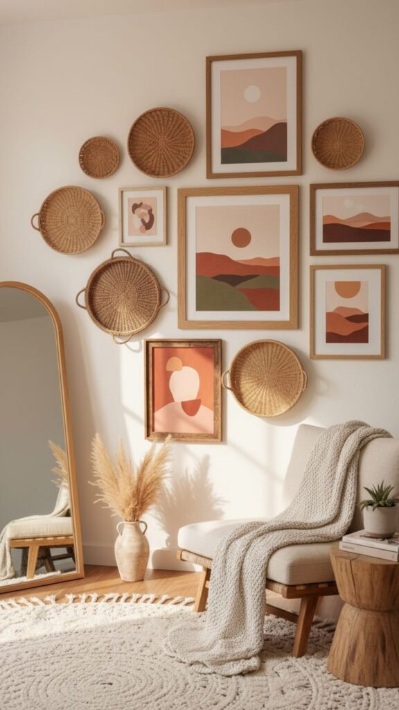 Use the corner walls to showcase a curated collection of art and woven pieces. This draws the eye upward and adds personality without taking up floor space.