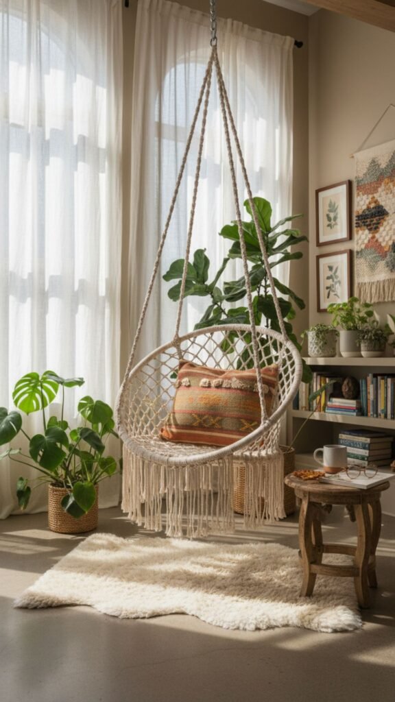 Install a hanging chair to create a playful and deeply relaxing corner. The gentle swaying motion provides a perfect escape after a long day.