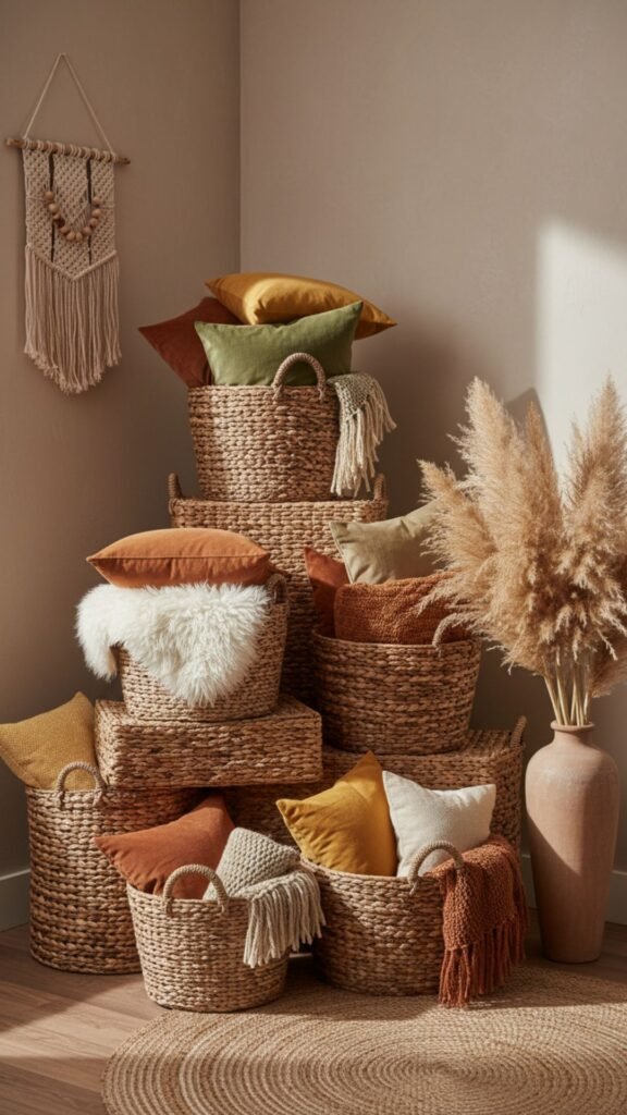 Combine functional storage with rustic aesthetic appeal. Stacking beautiful woven baskets keeps clutter out of sight while enhancing the boho vibe.