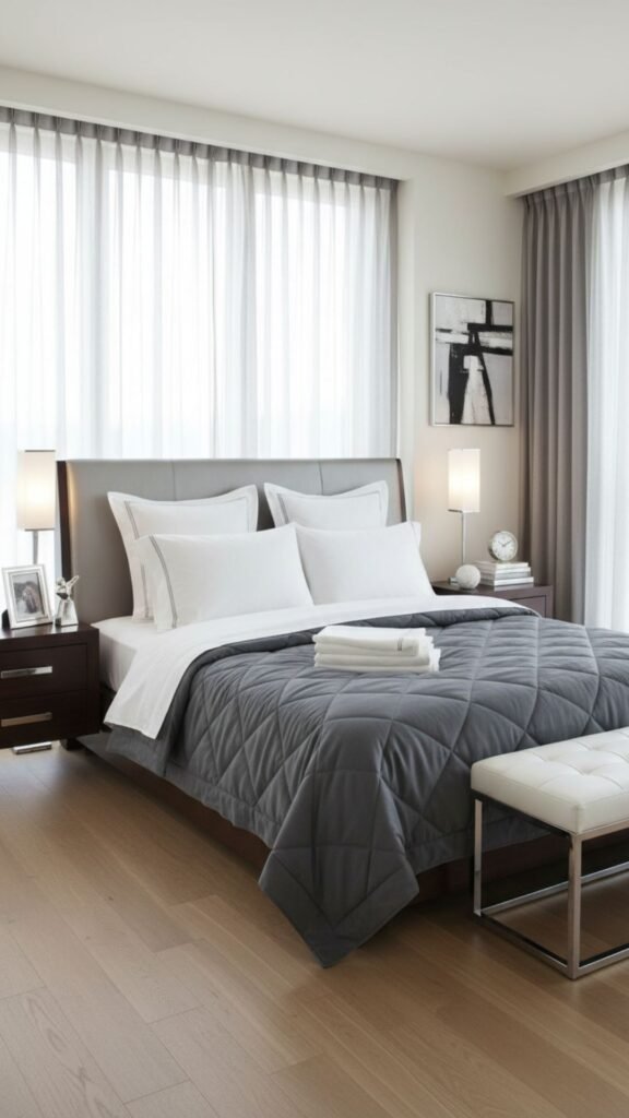 Grey is the ultimate neutral for a modern, hotel-inspired bedroom. A quilted grey coverlet pairs beautifully with white or charcoal bedding, giving the room a cool, calm sophistication.
