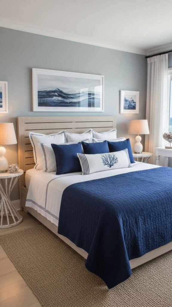 - Add navy and white striped or solid accent pillows for a layered look