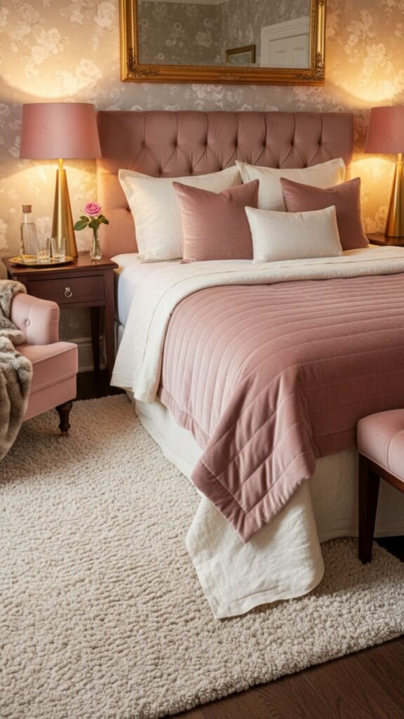 For a bedroom that feels warm and luxurious, blush pink velvet is a stunning choice. This soft, romantic option adds texture and a touch of glamour that feels straight out of a boutique hotel.