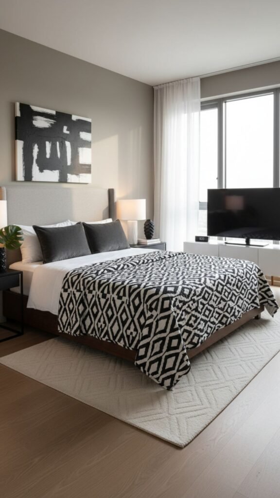 - Select a quilt with a bold geometric print in black, white, or charcoal