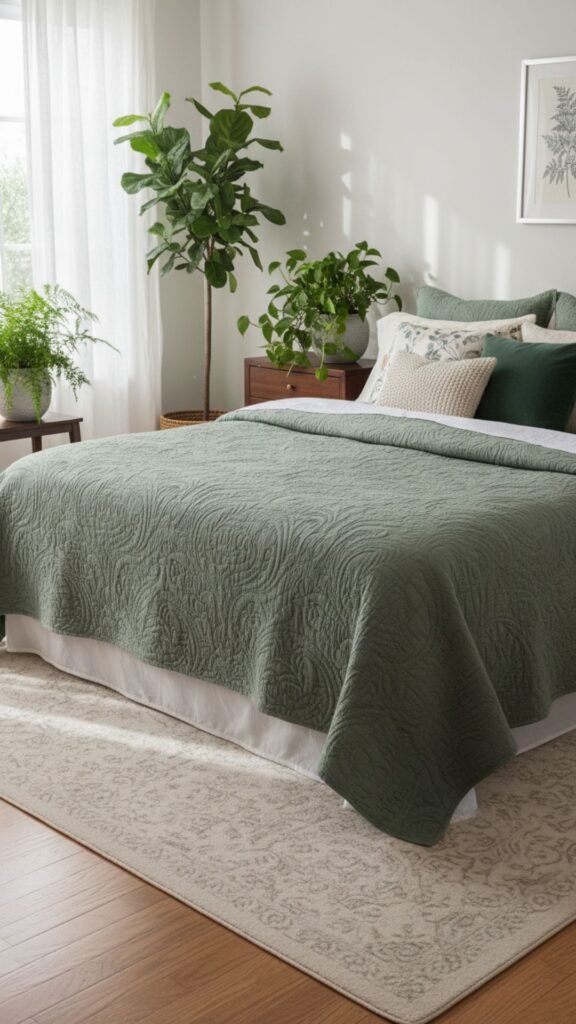 - Choose a sage green matelassé quilt or coverlet with a raised floral or scroll pattern