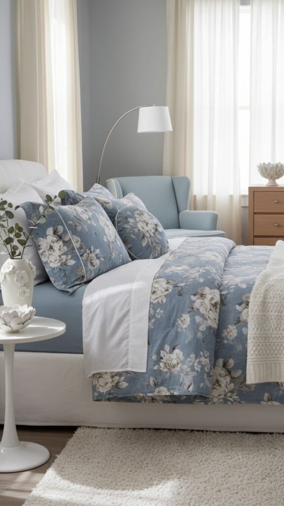 - Look for a dusty blue floral quilt with a muted, watercolor-style print