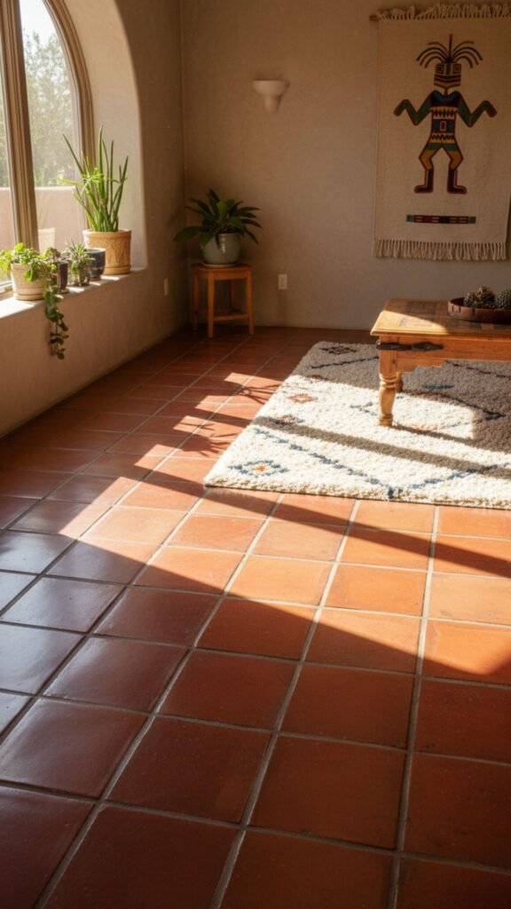 Baked earth tiles bring a warm, southwestern rustic vibe to your living room. Their deep, rich reddish-brown tones radiate warmth and comfort. Terracotta is highly durable and ages beautifully over time.