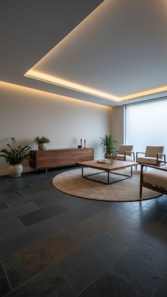Slate provides a cool, moody contrast to warm wooden furniture. Its naturally textured surface prevents slipping and adds incredible depth to the room. The dark gray and blue undertones ground the space effectively.