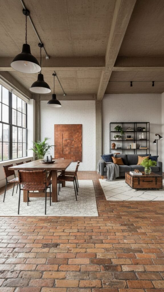 Exposed brick isn’t strictly for walls. Using thin brick pavers on the floor creates a rustic, industrial-farmhouse fusion. The porous surface and varied red tones add immense warmth and vintage appeal.