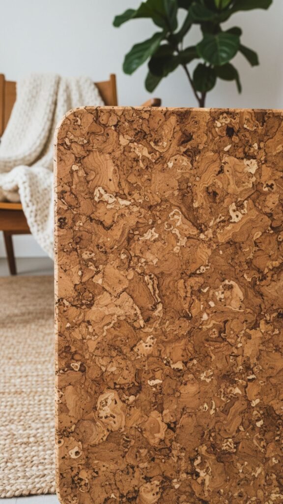 Harvested from the bark of cork oak trees, this material is highly sustainable. It offers a soft, cushioned feel underfoot and naturally insulates the room. The speckled, earthy texture fits perfectly into a rustic motif.