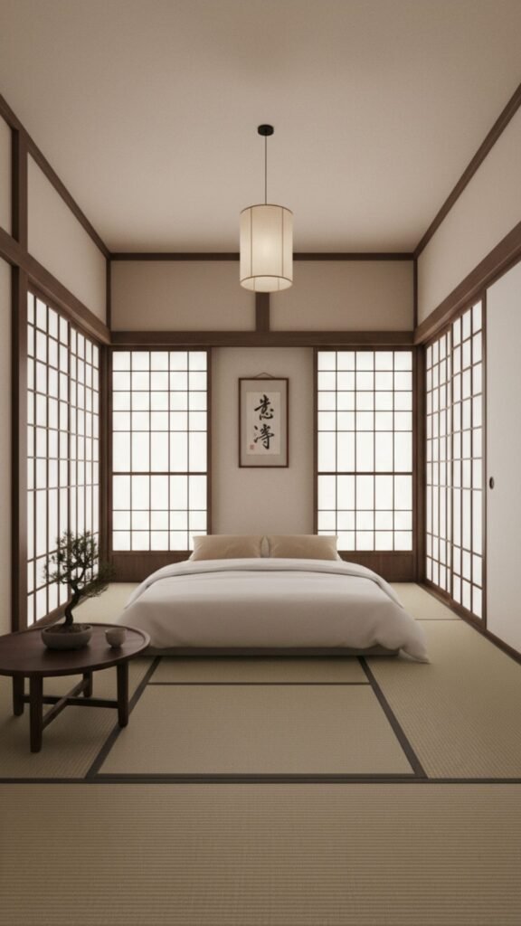 Japanese bedrooms typically feature soft, earthy tones that mimic nature. These calming colors help reduce stress and create a serene sleeping environment.