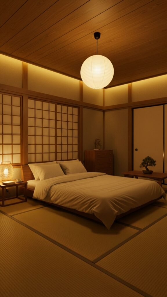 Harsh overhead lighting disrupts the calm atmosphere of a Japanese bedroom. Soft, warm lighting promotes relaxation and signals to your body that it’s time to wind down.