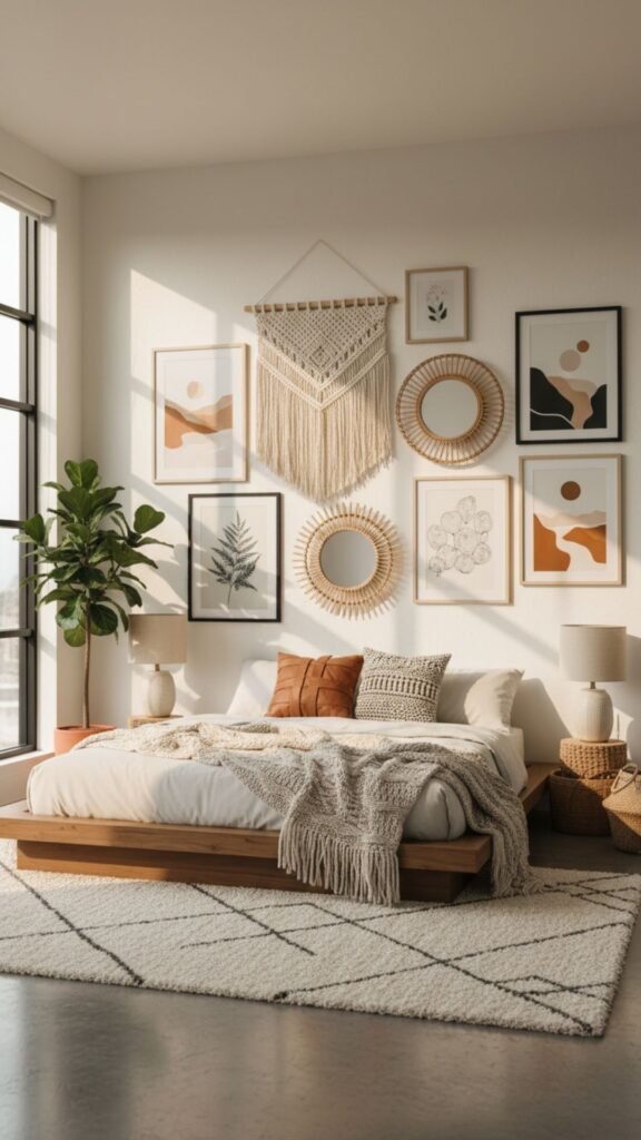 Forget flat photo frames. A gallery wall that combines paintings, woven wall hangings, mirrors, and sculptural elements creates a layered, curated look that feels personal and visually dynamic. The key is mixing textures—rough macramé next to a sleek metal frame, for example, creates a striking contrast.