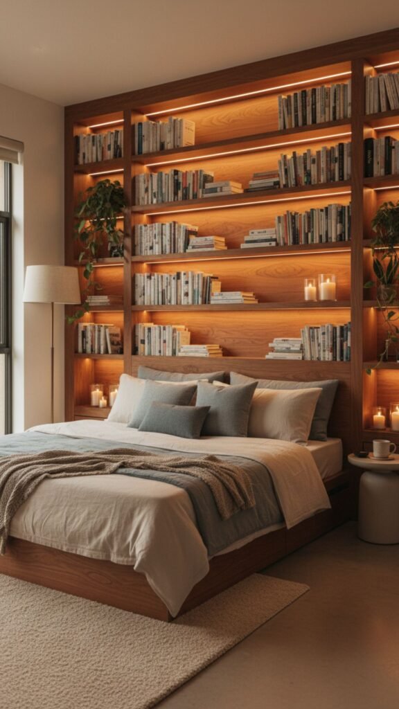 A headboard that doubles as a bookshelf is both functional and striking. It creates a focal wall, provides storage, and adds a layered, lived-in feel that’s rare in most bedrooms.