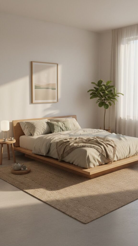 Japandi is a design philosophy that blends Japanese minimalism with Scandinavian warmth. The result? A calm, clutter-free bedroom that feels both serene and stylish. Think natural materials, muted tones, and simple forms.
